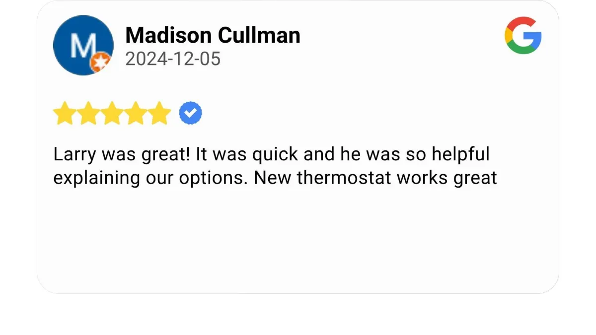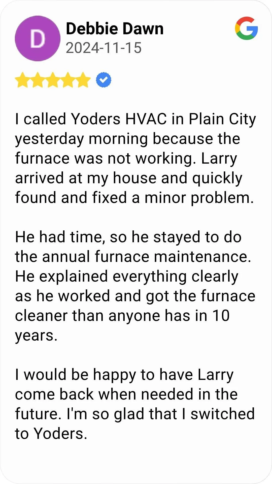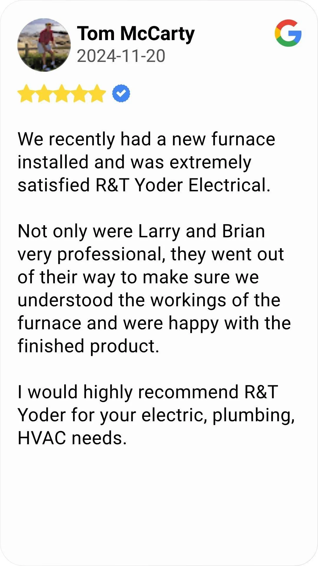 At Yoder HVAC, we take pride in our HVAC expertise and value customer feedback. With over 20 years of committed service in the electrical, plumbing and HVAC industries, we use feedback to continually improve and ensure customer satisfaction. Discover what our clients have to say about their positive experiences and the high-quality HVAC solutions we deliver.